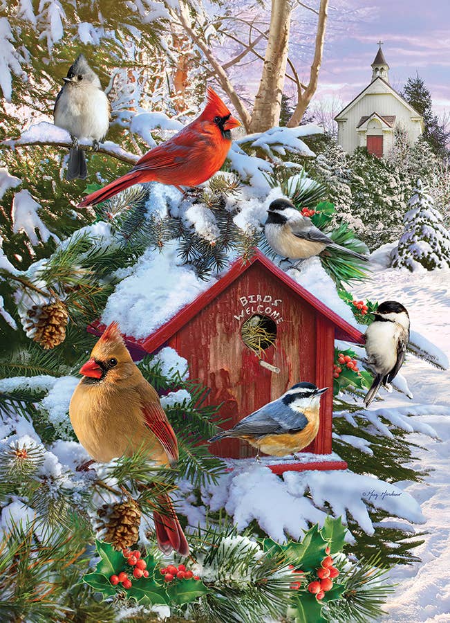 Is there a more Christmassy bird than a cardinal? Nuthatches and chickadees also congregate at the feeder on a fine crisp winter’s day. Bless this House by Greg Giordano is a classic puzzle image for Christmas, winter, or any time you want to enjoy a refreshing nature puzzle.